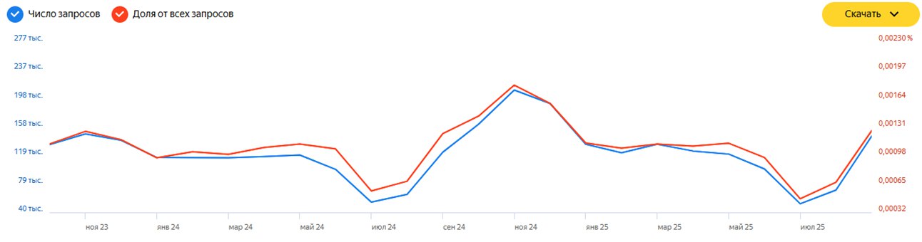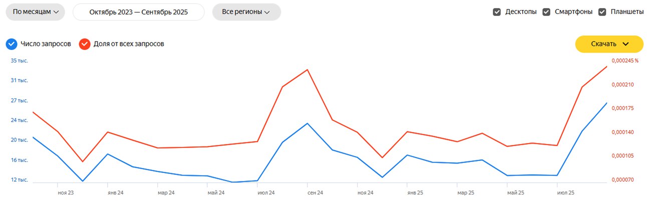 На фотографиях - спрос по двум целевым запросам (детская секция и школа развития). Мы можем заметить, что для запроса “детская секция” пиковыми по запросам являются август, сентябрь, октябрь. Для запроса “школа развития” пиковыми являются август, сентябрь, октябрь, ноябрь. Данный сервис берет статистику с Яндекса, но в Вконтакте динамика схожа.