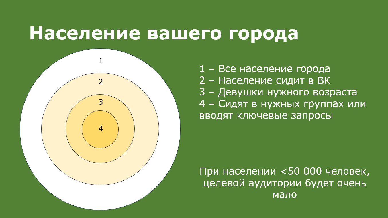 Перед запуском рекламы стоит оценить сколько целевой аудитории есть в вашем городе или районе. Если население вашего города >100 000 человек, то можете не переживать, целевая аудитория в вк точно есть.